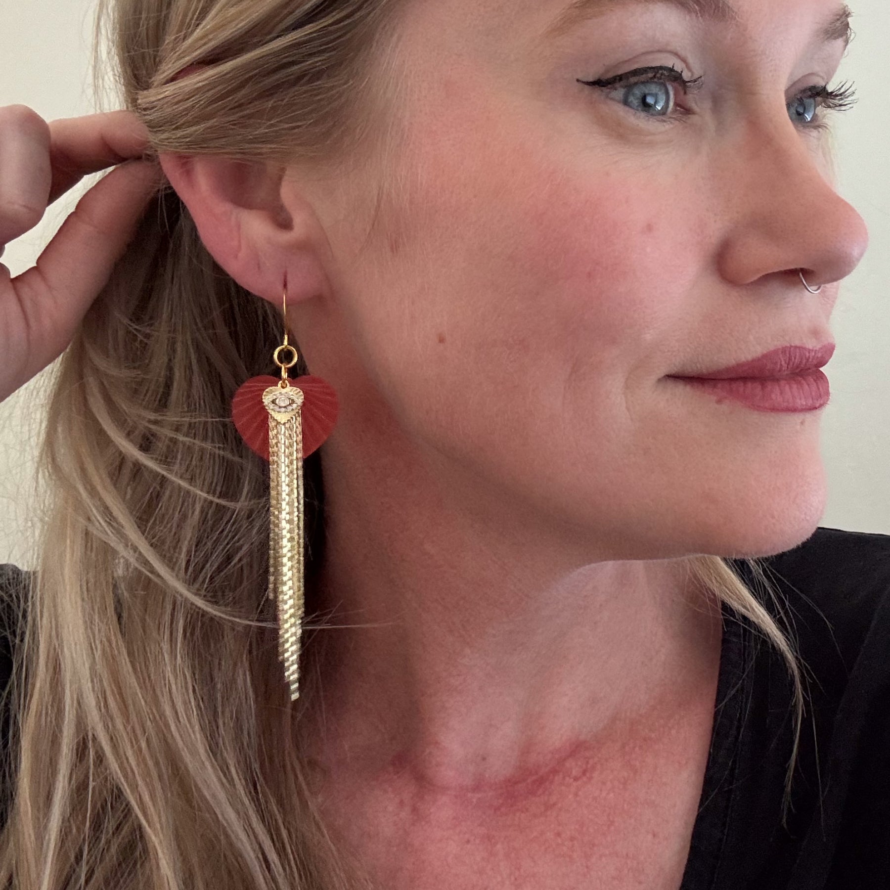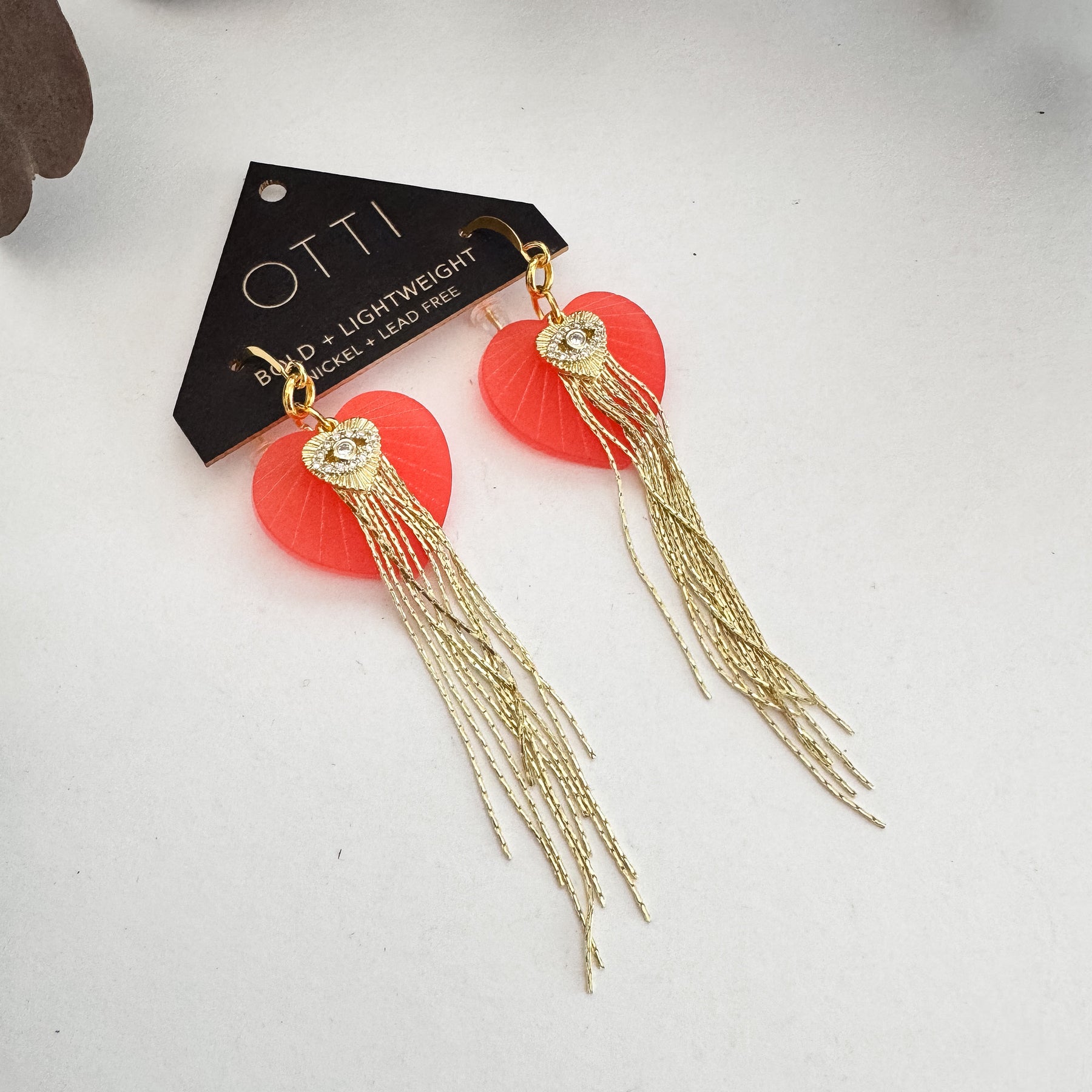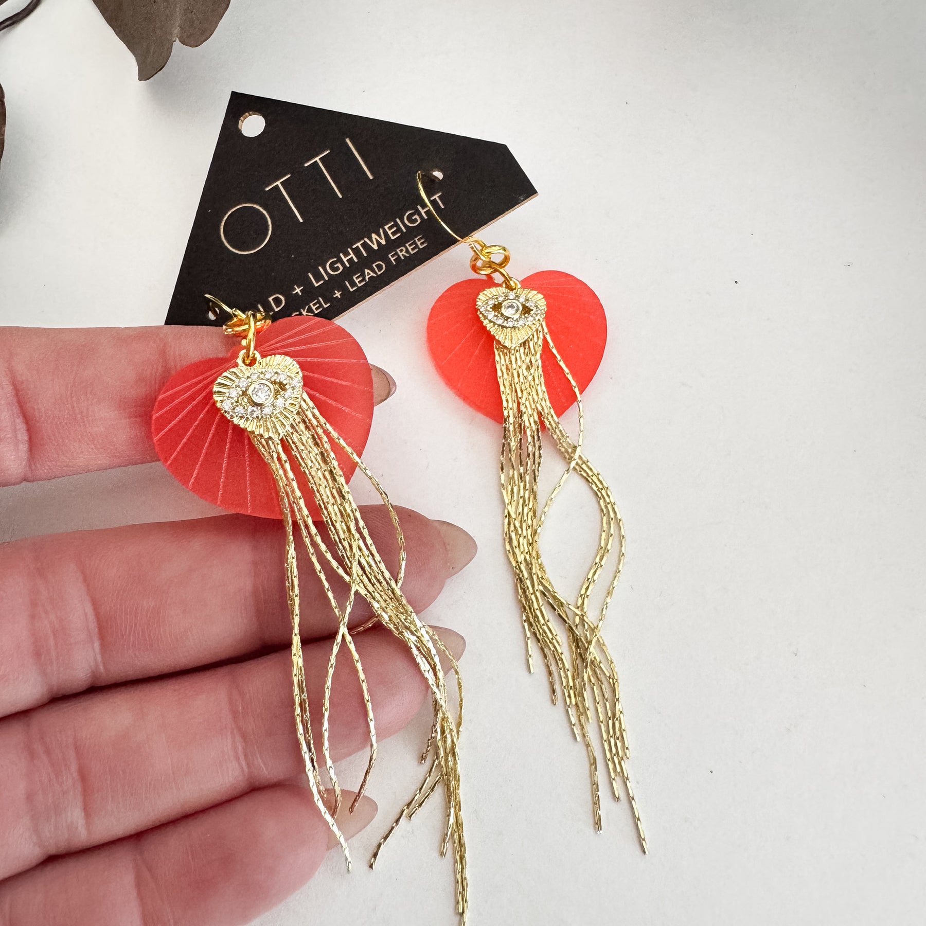These sparkly Sacred Heart/Evil Eye Earrings pair etched coral acrylic with delicate 18k gold–plated fringe that sways softly with every move. At the center, a subtle sparkling eye charm—whether seen as the Evil Eye or a sacred heart—adds a quiet layer of protection and meaning. Elegant, lightweight, and full of graceful motion, they bring a touch of shimmer and symbolism to nights out, special occasions, or everyday confidence.